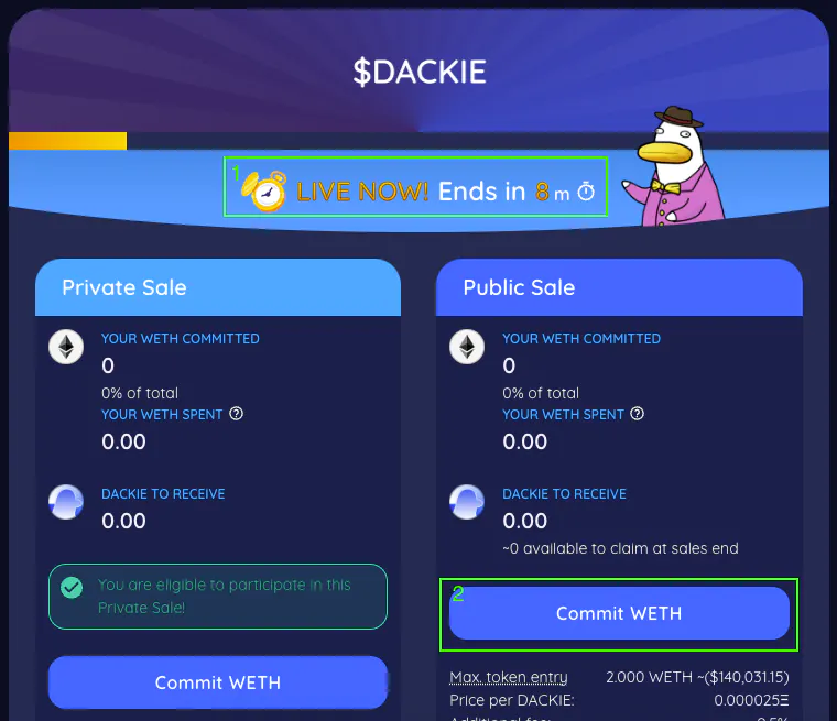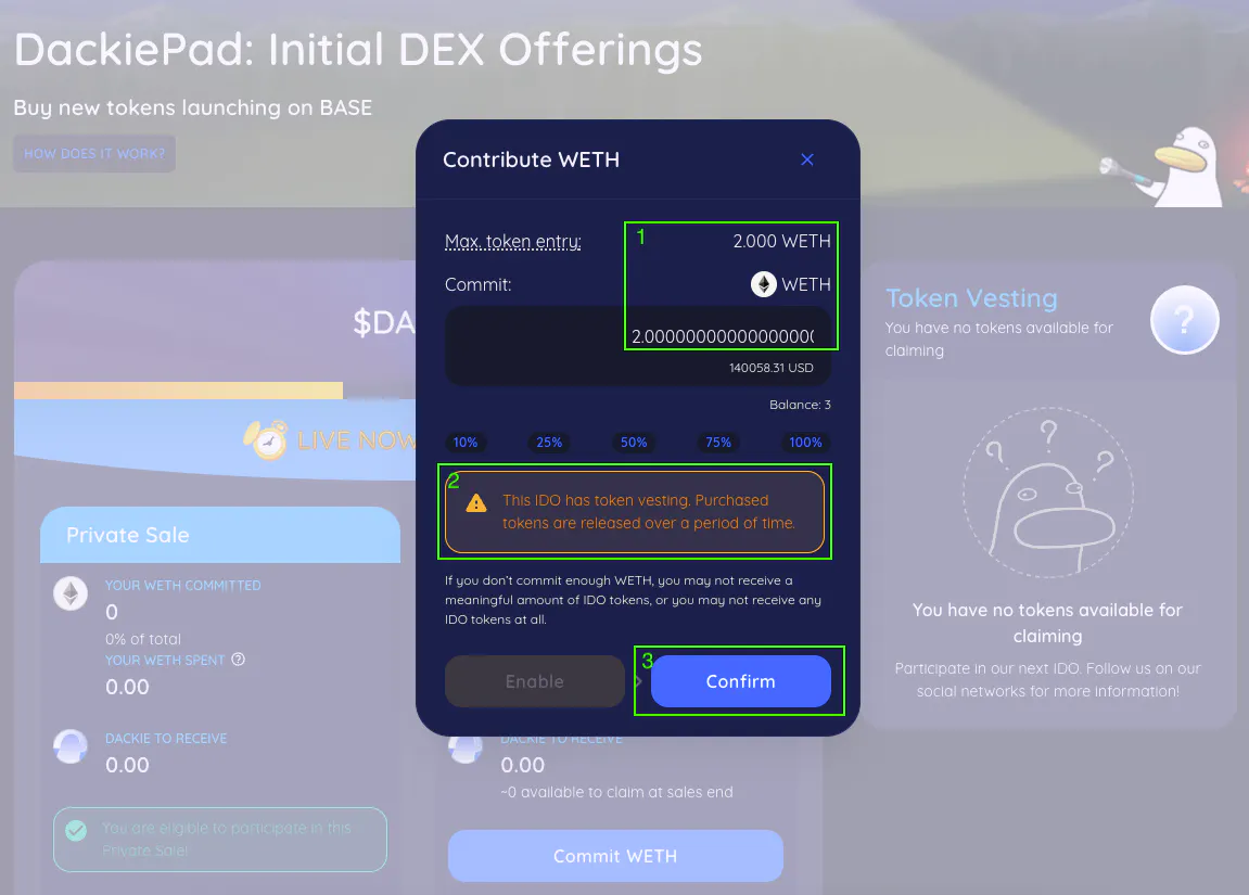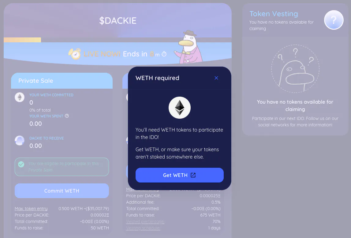 Section #4: When you're ready to participate in the IDO, click 'Enable'.This grants authorization to the IDO contract, allowing it to utilize your WETH tokens in your wallet for pool commitments (most DackiePad IDOs use WETH for fundraising, unless there are specific exceptions).